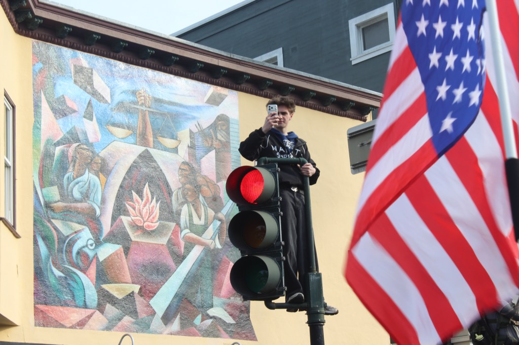 A protester on top of a traffic light on Dolores St. on Friday Jan. 30, 2026. Photo by Paul Singh