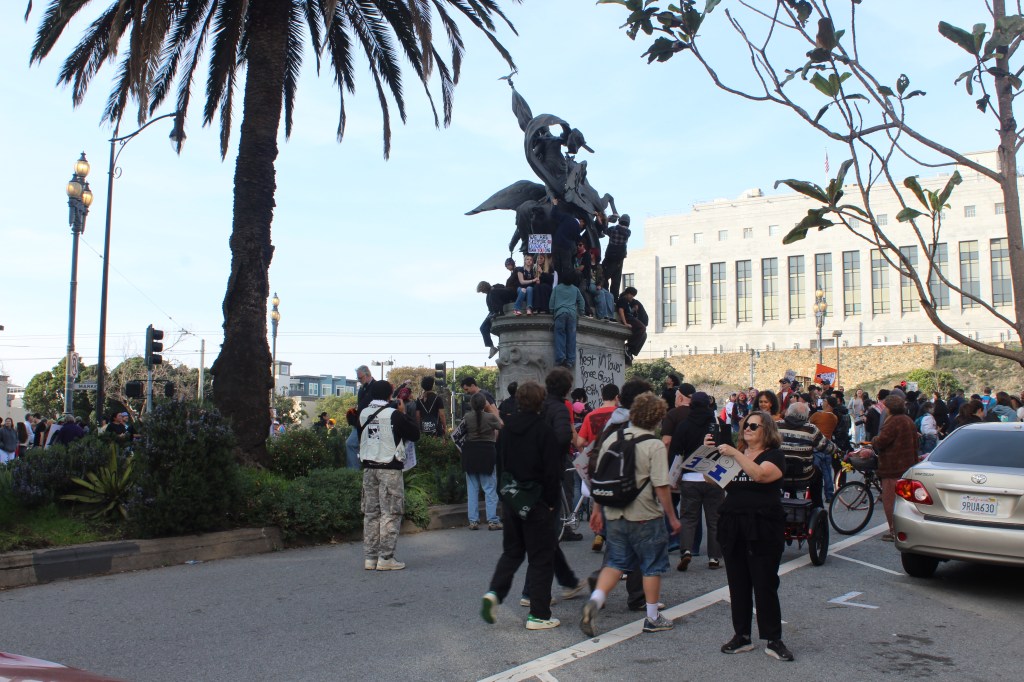 During the march there were a few protesters who were climbing up on street lights to film the protest. They had also climbed up on the California Volunteers sculpture in Duboce Triangle.